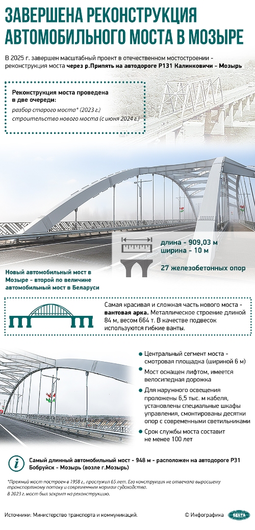 6 ноября Президент Беларуси Александр Лукашенко открыл в Мозыре обновленный мостчерез реку Припять. Глава государства в торжественной обстановке перерезал символическую красную ленточку. На церемонию были приглашены представители трудовых коллективов дорожных организаций, участвовавших в строительстве моста, жители Мозырского района.